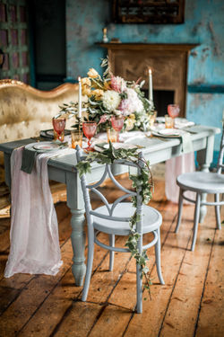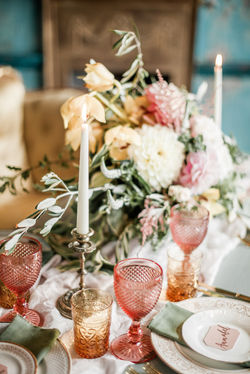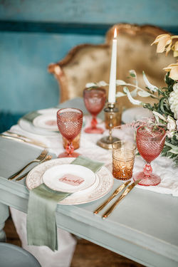 We took inspiration from shades of blush, sage and gold with hand dyed fabric gift wrapping and an opulent tablescape.
